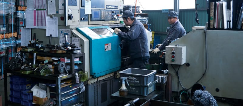 当工場では、長年積み上げてきた研究及び独自の加工技術をNC旋盤に取り入れることにより、特殊な形状物、ミクロン単位の精密部品から削り代の多い重旋削まで、あらゆる物を加工できる技術を保持しています。6旋盤ラインのうち、半数が単能機ラインで単品から量産まで対応可能。鉄はもちろん、特に難加工材、ステンレス、アルミなどを得意としています。製品の加工はもとより、検査体制においても力を入れ、形状測定器の導入など、お客様のニーズにあった製品造りを常に心がけています。